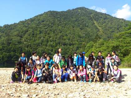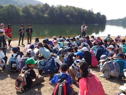 湖畔で集合写真を撮ったら、いよいよハイキングに出発です。
