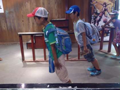 ここは「忍者怪怪亭」。家が斜めになっていて、引力がねじ曲げられたような不思議な感覚が味わえます。子どもたちに大人気です。でも、ちょっと気持ちが悪くなりそうです。