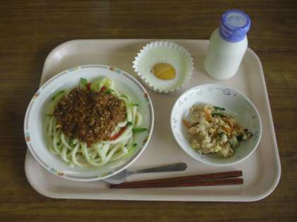 今日の給食は、冷やし肉みそうどん、フーイリチー、おかしな目玉焼きです。9月の給食目標は「よくかんで食べよう」です。よくかむことで虫歯の予防や、消化を助けることができます。麺類はつるつるとして食べやすいですが、一口ずつよくかんで食べてください。