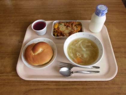 今日の給食はミルクパン、かぼちゃのグラタン、キャベツスープ、ぶどうゼリーです。かぼちゃは夏が旬の野菜ですが、冬まで保存することができ、風邪の予防効果がある食べ物です。暑かったり、肌寒かったりする時期ですが、かぼちゃを食べて風邪に負けない体をつくってください。