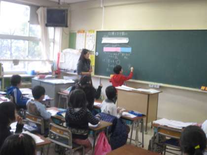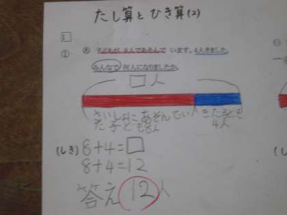 算数の授業です。足し算、引き算をテープ図に表わして解きます。テープ図は、高学年になっても使います。問題を解くときの考え方を表わします。その基礎をやります。子供たちは、問題の意味を考えながら、しっかり書けていました。もうすぐ3年生になります。