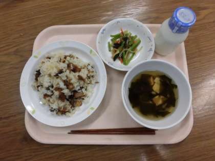 今日の給食はさんまごはん、おひたし、すまし汁です。今日から10月になります。10月の給食目標は「時間を守って食べよう」です。配膳、食事、かたづけの時間を意識して、時間内に食べ終わるようにしましょう。