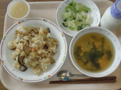 今日の給食は秋の香りごはん、かきたまじる、ひとしお野菜、りんごゼリーです。秋がしゅんのさつまいもや栗を使ったメニューです。はだや目を同じように舌でも季節を感じてみてください。レシピをホームページにのせたので、興味のある人はおうちでも作ってみてください。