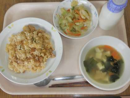 毎月21日は「つけ物の日」だそうです。そこで今日の給食はつけ物のたくあんとキムチを使った「キムタクご飯」「キャベツのナムル」「わかめスープ」「牛乳」にしました。つけ物は冷蔵庫などない時代に食べ物を長期間保存できるようにした食べ物です。パリパリとしたつけ物特有の食感なども感じながら食べてください。