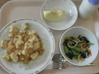 今日の給食は「麻婆豆腐どん」「ナムル」「りんご」「牛乳」です。