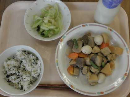 今日の給食は「わかめとじゃこのごはん」「とり肉と里いものうまに」「キャベツの塩こんぶかけ」「牛乳」です。