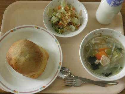 今日の給食は「ビスキュイパン」「ベーコンと白菜のスープ」「ごぼうチップサラダ」「牛乳」です。ごぼうにはお腹の調子を整えたり、せきをおさえてくれるはたらきがあります。ごぼうチップサラダのレシピをホームページにのせたので、きょうみのある人はおうちでも作ってみてください。