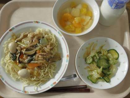 今日の給食は4年生のリクエスト給食である「フルーツ白玉」と、「八宝麺」「野菜の中華風味」「牛乳」です。アンケートの結果は1位がフルーツ白玉、2位が冷凍みかん、3位があげパンでした。来月は5年生のリクエスト給食を出す予定です。楽しみにしていてください。