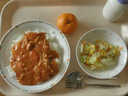 今日の給食は「ハヤシライス」「コーンサラダ」「みかん」「牛乳」です。コーンサラダのキャベツは世田谷区内で育てられたものを使っています。地域でとれた新せんな野菜の味を感じながら食べてください。