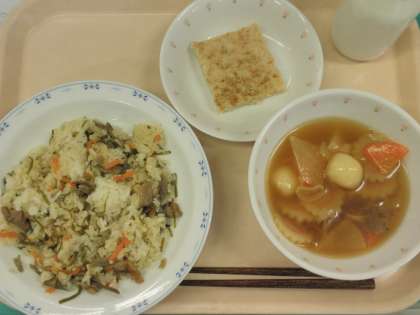 今日から3学期の給食が始まります。メニューは「ぶた肉とゴボウのごはん」「松風焼き」「おぞうに」「牛乳」です。おぞうにはお正月に食べる日本の伝統料理の一つです。地域によっていろいろな味、具材が入っています。給食ではしょうゆ味の関東風のおぞうににしました。