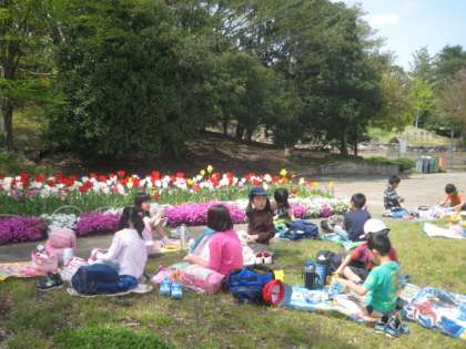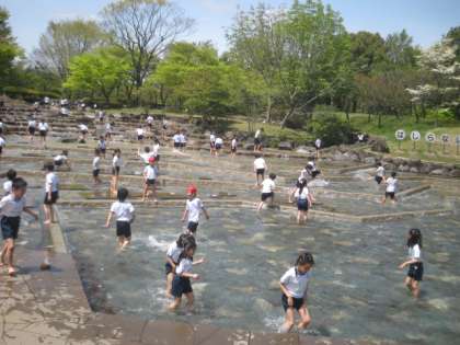オリエンテーリングが終わると、水遊びです。暑かったので、気持ちがよかったようです。グループでお弁当を食べ、新しい友達が増えました。