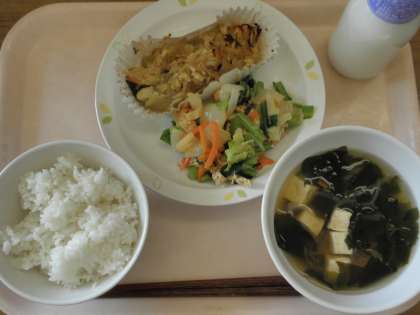 今日の給食は「ごはん」「鮭のちゃんちゃん焼き」「おひたし」「すましじる」「牛乳」です。鮭のちゃんちゃん焼きは北海道の郷土料理で、チャンチャンという音を立てながら手パンで焼いたことが名前が由来とされています。鮭には骨があるので気をつけて食べてください。