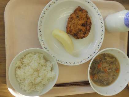 毎月19日は食育の日です。そこで今日の給食は青森県の郷土料理である「いかめんち」「せんべいじる」「ごはん」「りんご」「牛乳」にしました。せんべいじるには小麦粉から作られた南部せんべいが入っています。初めて食べる人もいると思いますが、食べずぎらいをせずにちょう戦してみてください。