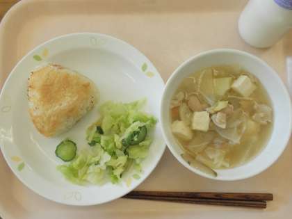 今週は全国学校給食週間なので、昔の給食をふり返るメニューの一週間にしました。今日の給食は「焼きおにぎり」「ひとしお野菜」「とんじる」「牛乳」です。日本で初めて給食として出されたのがおにぎりでした。今日の給食が少ないと感じる人もいるかもしれませんが、これでも当時はごちそうです。昔の人の生活について考える機会にしてください。