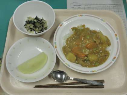 昔は給食といえばパンが主流でしたが、今から40年前から給食でご飯が出るようになりました。そのころからカレーライスが全国的に広がったといわれています。そこで今日の給食は「カレーライス」「大根サラダ」「りんご」「牛乳」にしました。