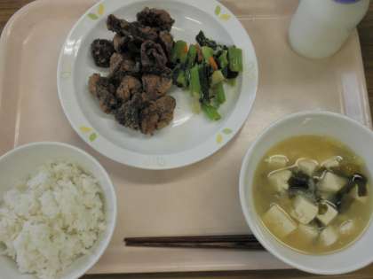 今日の給食は「麦ごはん」「クジラの竜田あげ」「野菜のおかかかけ」「みそしる」「牛乳」です。今ではあまり見かけなくなりましたが、約30年前まではよく給食にクジラが出ていました。初めて食べる人もいると思いますが、一口だけでもちょう戦してみてください。