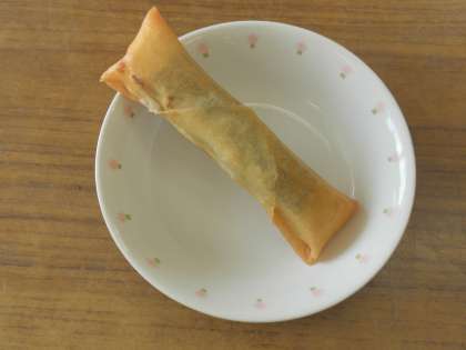 3.春巻きの皮の上に焼きのり、もち、1をのせ、包む。巻き終わりに2のドロをつけて、しっかりとじる。