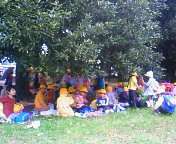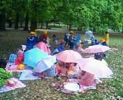12時、お弁当の途中、突然の雨、木の下に避難。でも、その後やんでよかったです。子どもたちのすばやい避難、さすがでした。