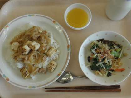 1月10日は「豚丼の日」なのだそうです。そこで今日は「豚丼」「ねぎ塩サラダ」「みかんゼリー」「牛乳」にしました。豚肉には体や血をつくったり、風邪の予防、疲れをとる働きがあります。しっかり食べて、風邪に負けない丈夫な体をつくってください。