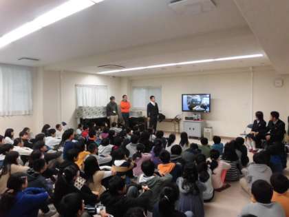 みのりの学び舎千歳中学校生徒会の皆さんが来校し、6年生のために作成した中学校生活紹介ビデオを上映しました。卒業を間近に控えた6年生にとって、部活動や学校行事等について知るよい機会となりました。千歳中学校生徒会のみなさん、ありがとうございました。