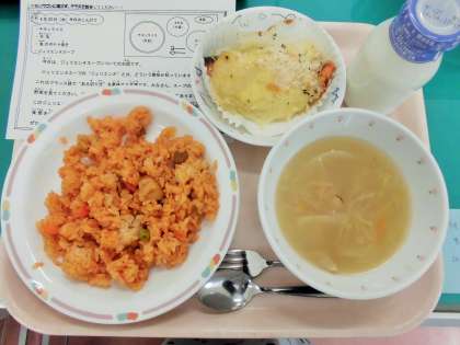 今日は、チキンライス、牛乳、魚のポテト焼き、ジュリエンヌスープです。