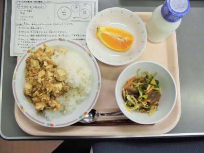 今日は、マーボー豆腐、牛乳、こんにゃくサラダ、デコポンです。