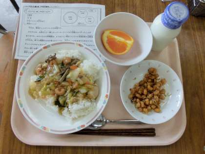今日は、中華丼、牛乳、大豆とじゃこの甘辛あげ、清見オレンジです。
