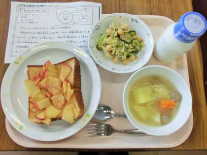 今日は、アップルトースト、牛乳、ビーンズサラダ、ウインナー野菜スープです。