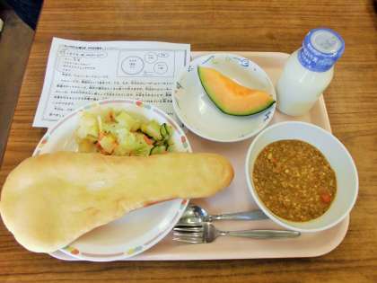 今日は、ナン、牛乳、ヘルシーキーマカレー、ポテト入りフレンチサラダ、メロンです。