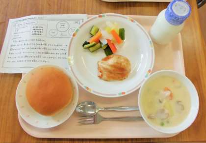 今日は、スライス入り丸パン、牛乳、鶏肉のバーベキューソース、ピクルス、森のチャウダーです。