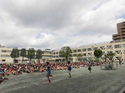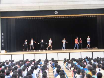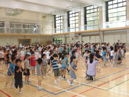 塚戸小名物ステップダンス集会がありました。体育委員会メンバーのお手本を見た後、みんなで踊ってみました。5分ぐらいで汗びっしょりです。これから、休み時間の終わりに音楽が流れ、全校で踊ります。早く覚えて、楽しく踊りたいですね。