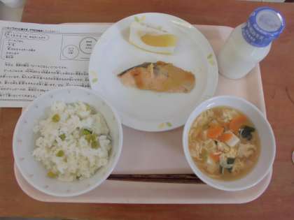 今日は、ピースごはん、牛乳、魚のみそマヨネーズ焼き、かきたま汁、みしょうかんです。