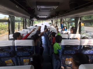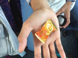 高速道路は空いていて、バスは順調に走っています。バスレクも始まりました。アメももらって嬉しいね。