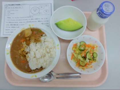 今日は、ジャーマンカレーライス、牛乳、フレンチサラダ、メロンです。
