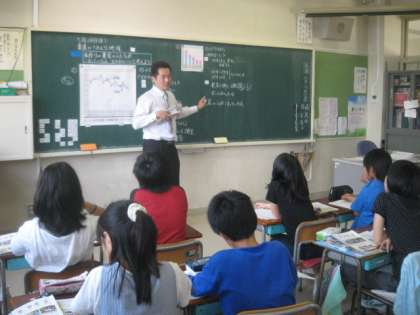 5年1組の担任は、伊藤教諭です。社会科の授業でした。米の生産量の変化のグラフと農業従事者の変化のグラフから、農家の人の悩みを考える授業です。事実から深く考えようとする力が育っている子どもたちです。