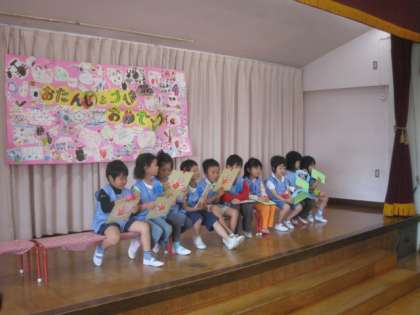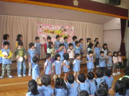 5月の誕生会でした。おめでとうございます。5月のお楽しみは、ゆり組さんの歌と手遊びでした。上手でした。年少さんもしっかり聞けていました。