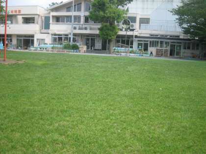 幼稚園の芝生の緑が濃くなっています