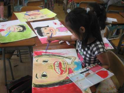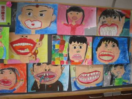 6月4日は、虫歯予防デーです。毎年、1年生から3年生まで歯の絵を描いています。3年生の教室をのぞくと、黒板いっぱいに歯の絵が貼ってあるので迫力がありました。子どもたちは勢いよく描いています。