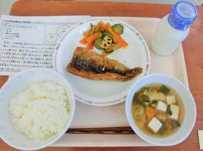今日は、ごはん、牛乳、鰯のかば焼き風、シャキシャキ野菜、すまし汁です。