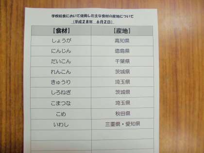 メモは、かば焼き風に使われている『鰯(いわし)』についてのお話です。鰯は、6月から10月くらいがおいしく、たくさんとれる時期で、千葉県や高知県でたくさんとれます。鰯は、水からあげるとすぐに死んでしまうことから魚偏に弱いという漢字で表されますが、栄養面や味、食べ方の幅広さを考えると私たちの強い味方となる魚です。特に栄養面では、疲れをとったり、がんなどの病気を防いだりする栄養のほか、頭の働きを活発にする栄養もたっぷり入っているので、一生懸命勉強をするみなさんにぴったりの食べ物です。小さな骨が入っていることがあるので、よくかんで食べましょう。