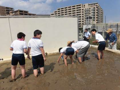 5年生児童が塚戸小名物田植えを行いました。学校運営委員、おやじの会、祖師谷郷土研究会、PTAの皆様もお集まりいただき、児童の指導とお手伝いにあたってくださいまいした。暑い中でしたが、初めての経験で子どもたちの大喜びでした。ご多用の中、ありがとうございました。