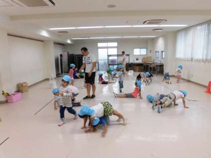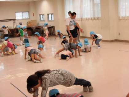 塚戸幼稚園の園児と学校に招き、体育の授業をしました。いろいろなやり方で体を動かしてみました。短時間で担当の先生も園児たちも汗びっしょりです。幼稚園が併設されている本校ならではの、幼少連携授業です。