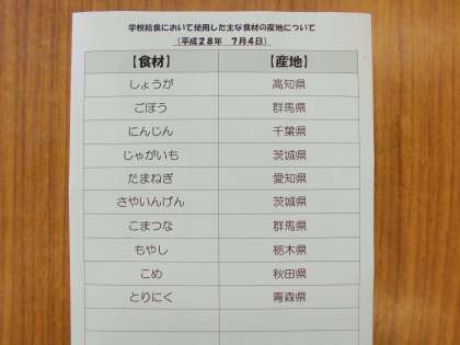 今日の給食の写真は、配置が違っています。本来は、ご飯が手前左、煮物が手前右、奥が野菜です。申し訳ありません。
