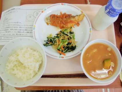 今日は、ごはん、牛乳、魚の南蛮揚げ、野菜のからしじょうゆかけ、かぼちゃのみそ汁です。