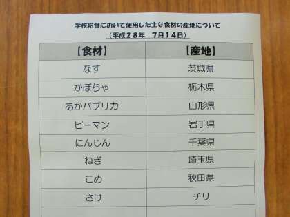 みなさん、1学期の給食も残すところあと3回となり、7月21日からは、お待ちかねの夏休みです。そこで今日は、夏休みの食事についてです。夏休みは外食が増え、みなさんが自分で食べ物を選ぶ機会も出てくると思います。そんなときは、今日の給食を思い出して参考にしてください。基本は、ごはん(またはパンや麺)と汁物、そしておかずが2品か3品です。おかずの内容は、肉や魚、卵、豆などを中心としたものが1品、野菜やきのこを使ったものが1品か2品です。特に夏場は、野菜やきのこが足りていないことが多いので、野菜やきのこ類を食べることを心がけましょう。