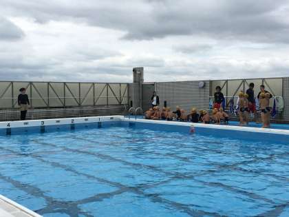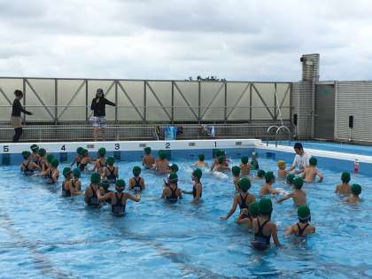 塚戸小学校には、夏休みに入っても元気に登校する子どもたちの姿をたくさん見かけます。夏季水泳では「リズム水泳」や「宝探し」で、楽しみながら浮いたり泳いだりする技能を高めています。今日は、校長先生も一緒に入りました。「バディチェック」では、隣の子とペアを組んで、プールから上がった時に人数を確認し合います。低学年も素早くチェックができるようになりました。