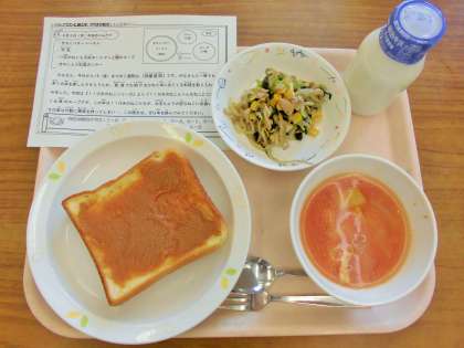 今日は、きなこバタートースト、牛乳、11匹のねこも大好き!!トマトと魚のスープ、きのこと小松菜のソテーです。