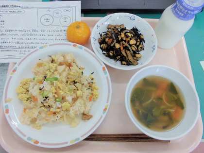 今日は、五目ずし、牛乳、大豆の磯煮、そうめん汁、冷凍みかんです。