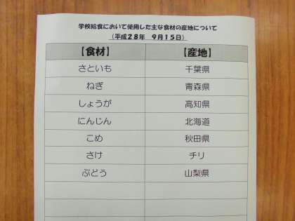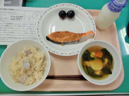 今日は、さといもごはん、牛乳、鮭のねぎみそ焼き、お月見汁、ぶどうです。