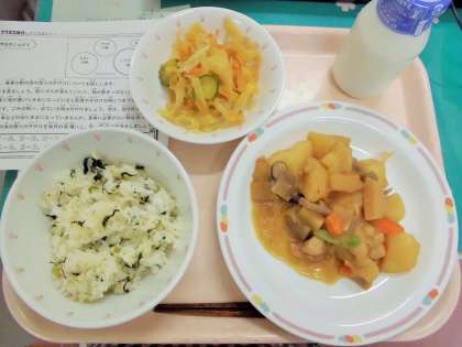 今日は、菜めし、牛乳、いろどり煮、パリパリサラダです。